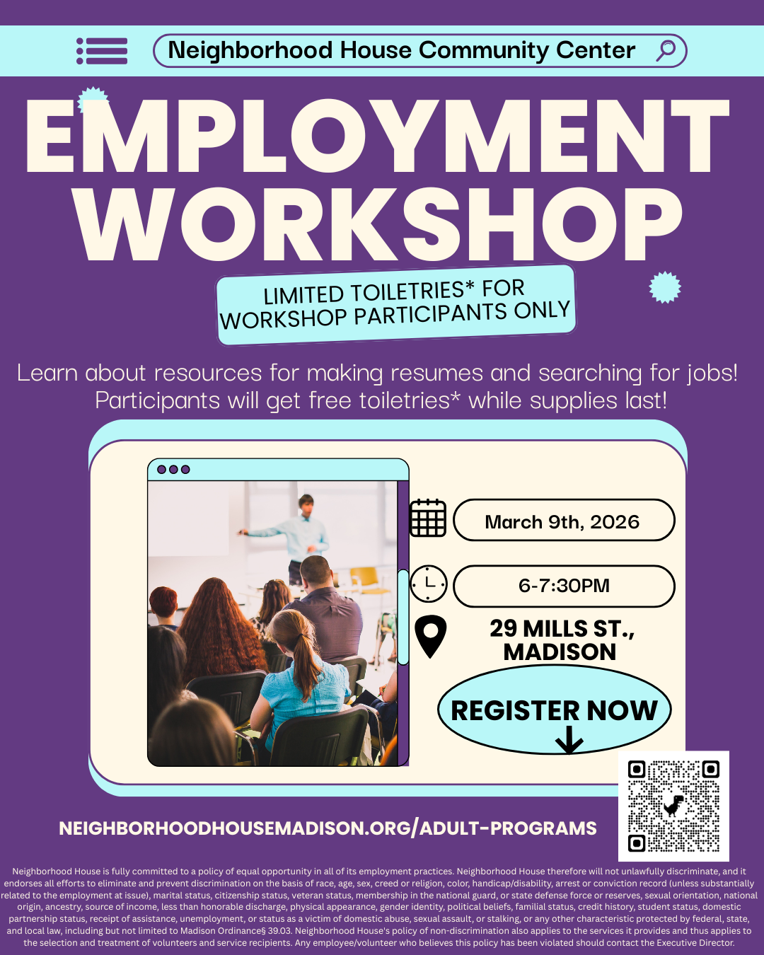 Monday, March 9th from 6-7:30PM @ Neighborhood House. We’ll talk about how to find a job, what employers look for, how to make a resume, and the skills that help you succeed. Whether you’re looking for your first job, switching careers, or facing challenges finding work, we’re here to help. Fill out this form to RSVP and let us know how we can best support you! If you need help filling out the form, call (608) 255-5337 or email info@neighborhoodhousemadison.org.