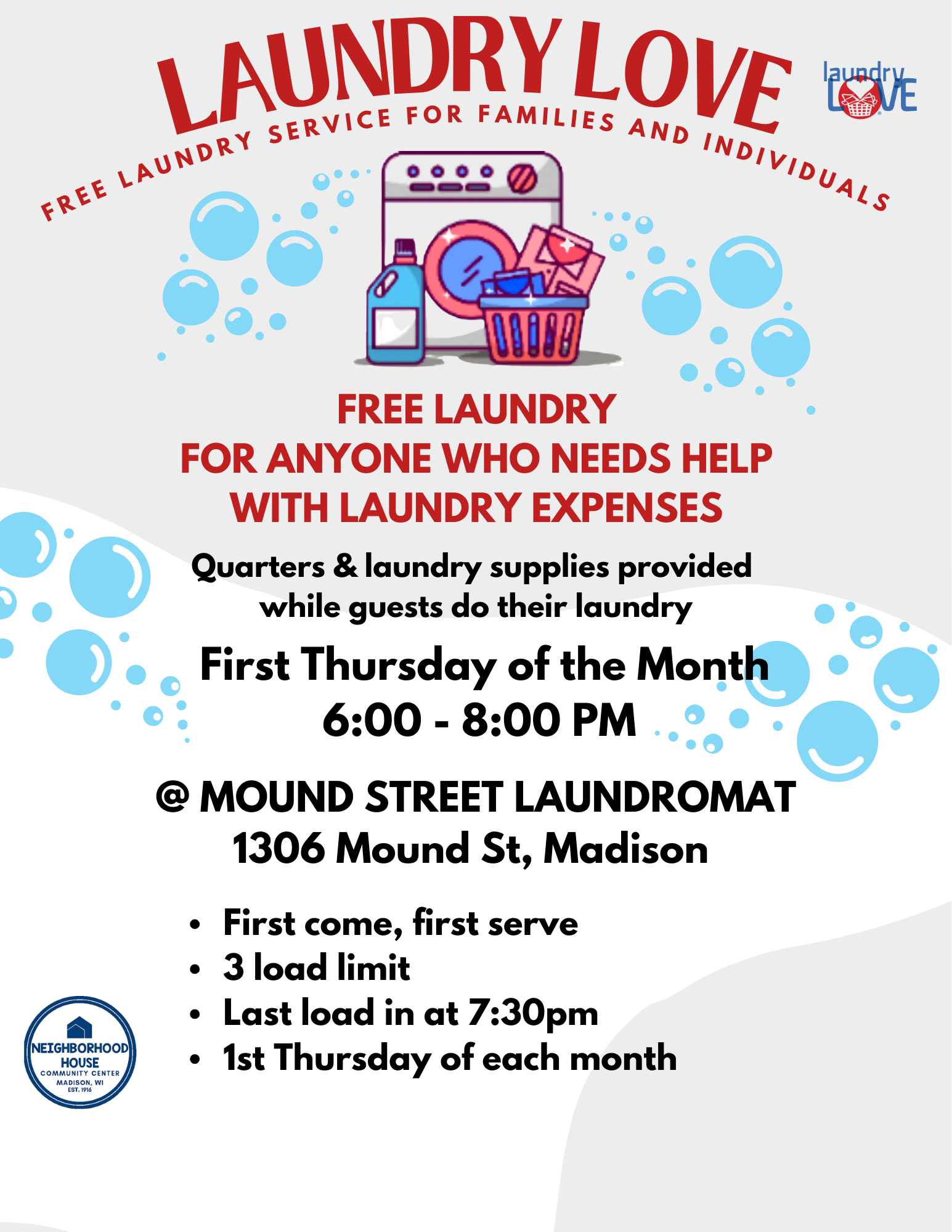 Neighborhood House provides a free laundry service, Laundry Love, once a month at the Mound Street Laundromat (1306 Mound St.). Laundry Love takes place on: